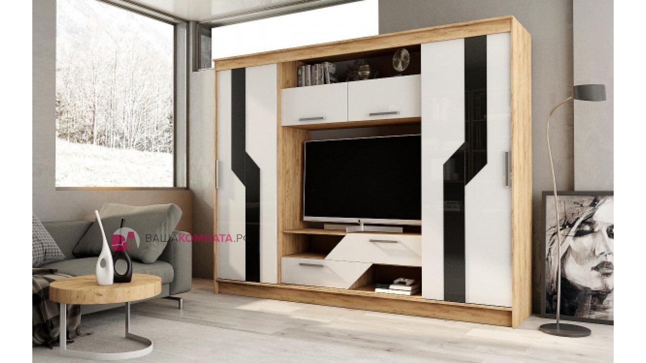 Гостиная «Кармен» - это пример современного и оригинального дизайна. Асимметричность и открытые полки обеспечивают визуальную лёгкость конструкции. В ней есть все, что необходимо для хранения вещей. Слева расположена секция со штангой, справа с полками.