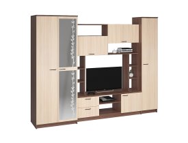 – Гостиная состоит из трёх модулей (шкаф платяной, шкаф бельевой, средняя секция), которые при желании можно устанавливать отдельно друг от друга, размещая в разных комнатах;