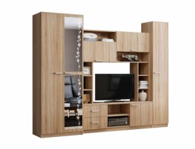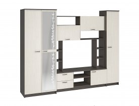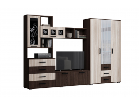 – Гостиная состоит из трёх модулей (шкаф платяной, шкаф бельевой, средняя секция), которые при желании можно устанавливать отдельно друг от друга, размещая в разных комнатах;