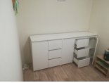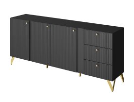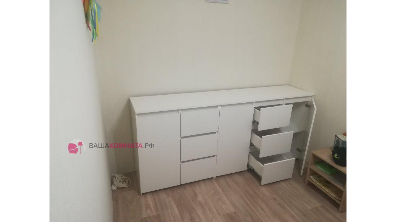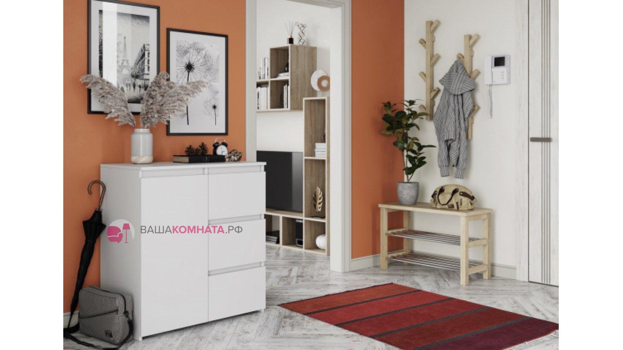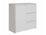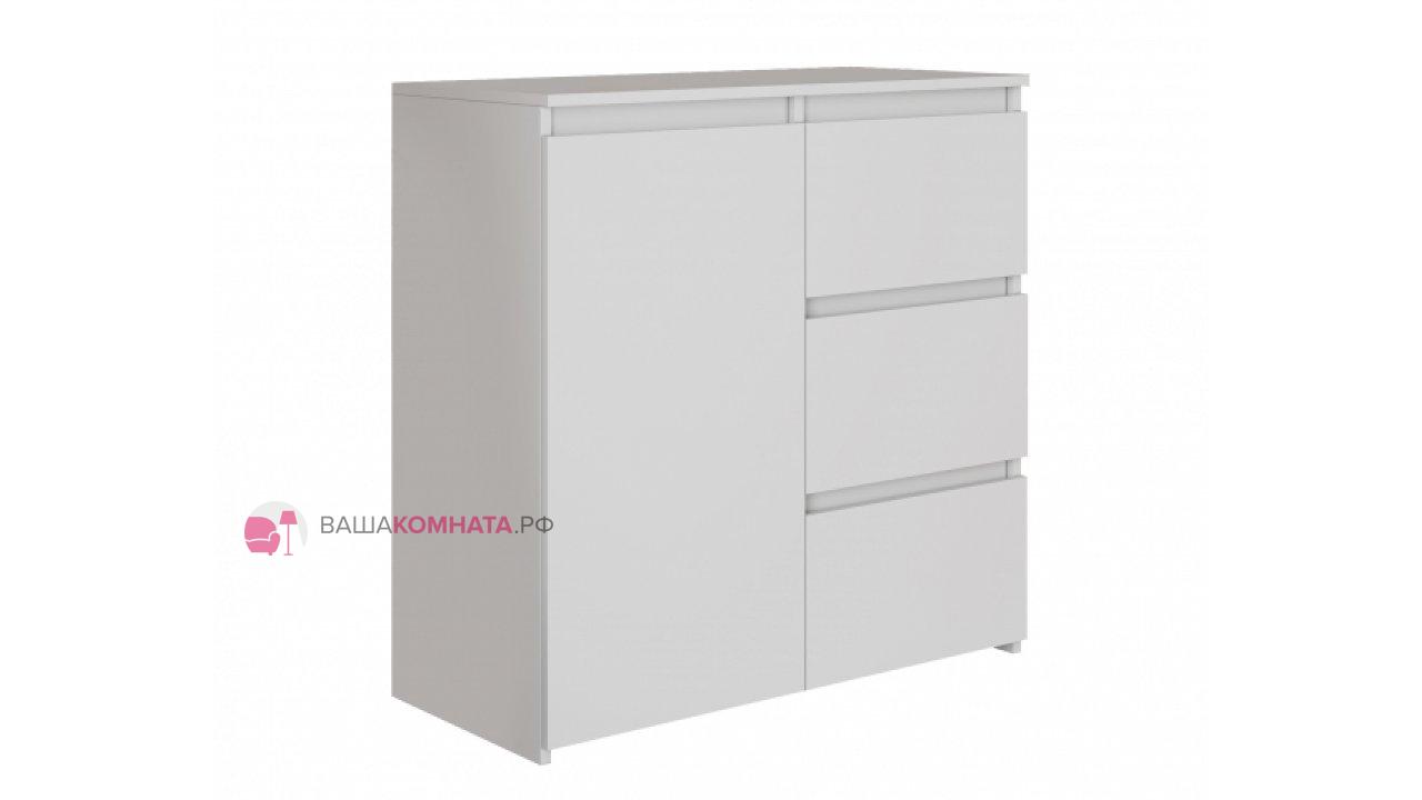 Комод состоит из 3‑х выдвижных ящиков на шариковых направляющих, полезным габаритом Д.323хВ.138хГ.368мм. с правой стороны, и распашной створкой с левой стороны, за которой находится отделение с полкой. Предусмотренный между фасадами ящика зазор в 30мм., а также утопленные вглубь корпуса декоративные планки, позволяют удобно браться за фасад при его открывании.