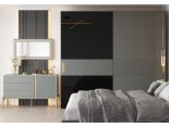 Фасады ОМРИ Комода КМ-001 внутренние. Между фасадами ящиков и створки располагается профиль-ручка GOLA («П»-образный, цвет-золото мат). Ручка GOLA создает углубление, это позволяет открывать дверь.