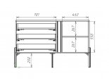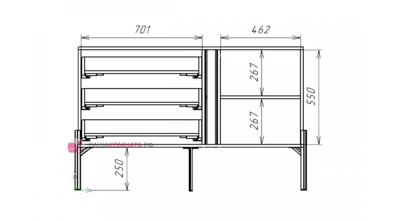 Корпус комода поделен на 2 части. Меньшая ниша Д.462хВ.550хГ.412 мм делится съемной полкой на 2 равных отделения 267 мм высотой. В большей нише Д.701хВ.550хГ.412 мм расположены 3 ящика на направляющих скрытого монтажа, оснащенные системой PUSH-OPEN.