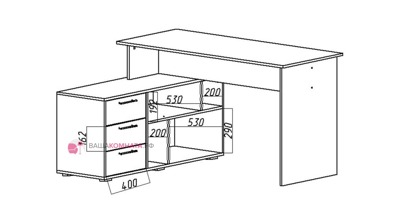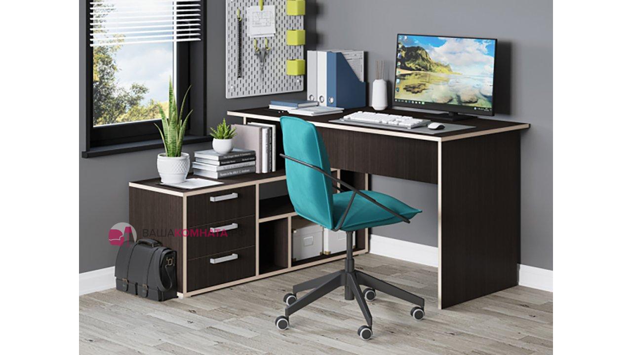 Стол очень вместительный и функциональный, он оснащён широкой столешницей, за которой будет удобно работать с компьютером, ноутбуком или учебными материалами. Также у стола есть боковая тумба, на которой можно дополнительно разместить оргтехнику, декор или книги.