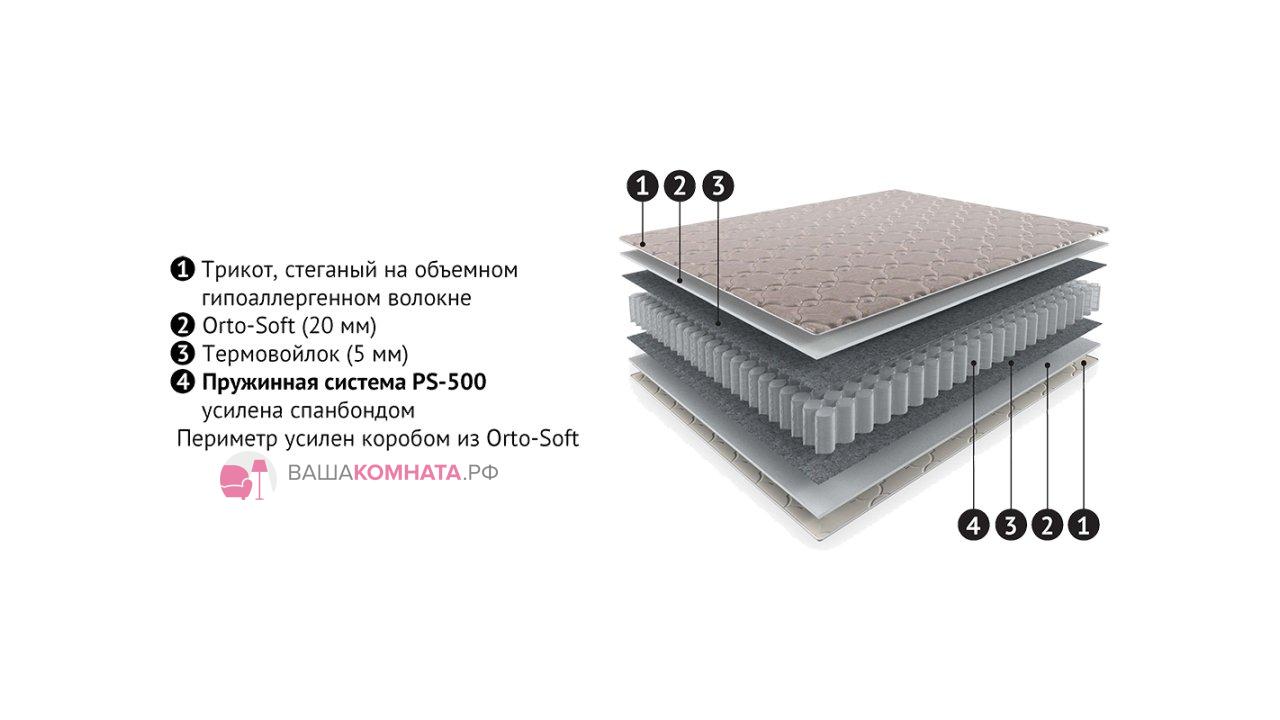 Матрас на независимом пружинном блоке PS-500 с одинаковой жесткостью сторон. Плотная ячеистая пена Orto-Soft высотой 20 мм улучшает анатомические свойства матраса, максимально повторяя контуры тела. Износоустойчивый термовойлок обеспечивает оптимальное давление пружин на тело по всей поверхности.