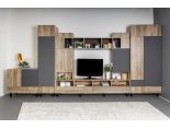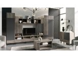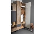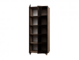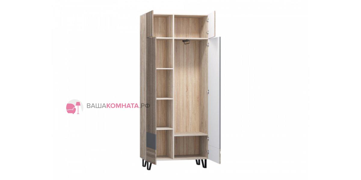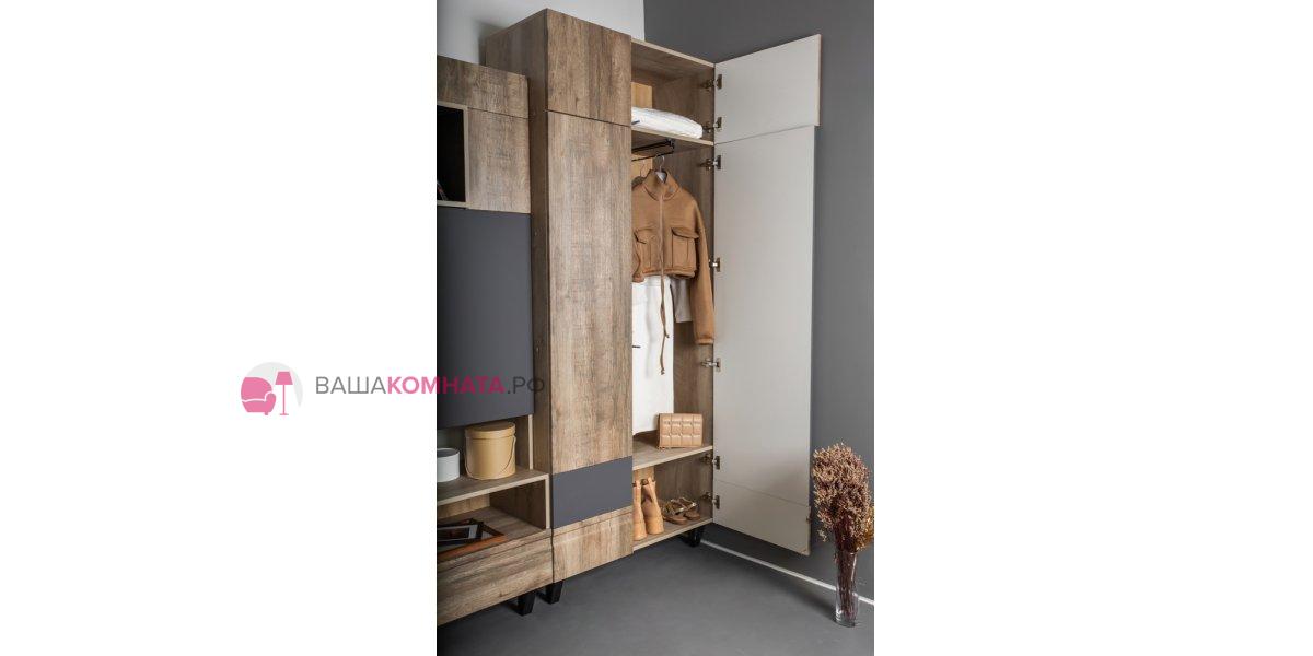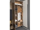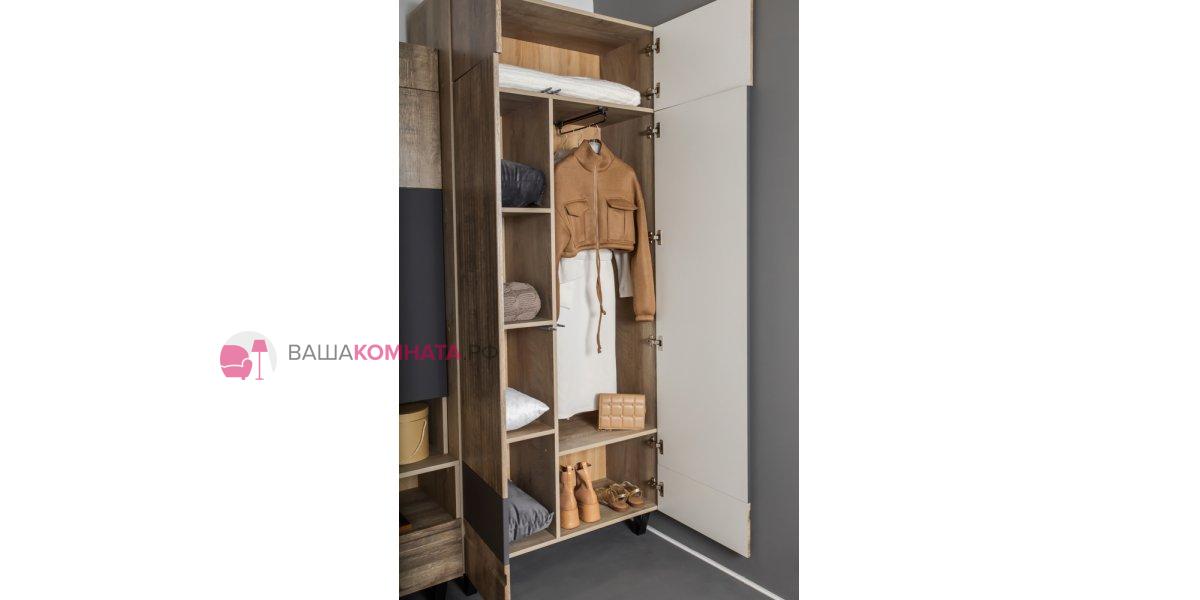Верху большая стационарная полка. Левая секция комплектуется 4 полками, правая - штангой для одежды и полкой.